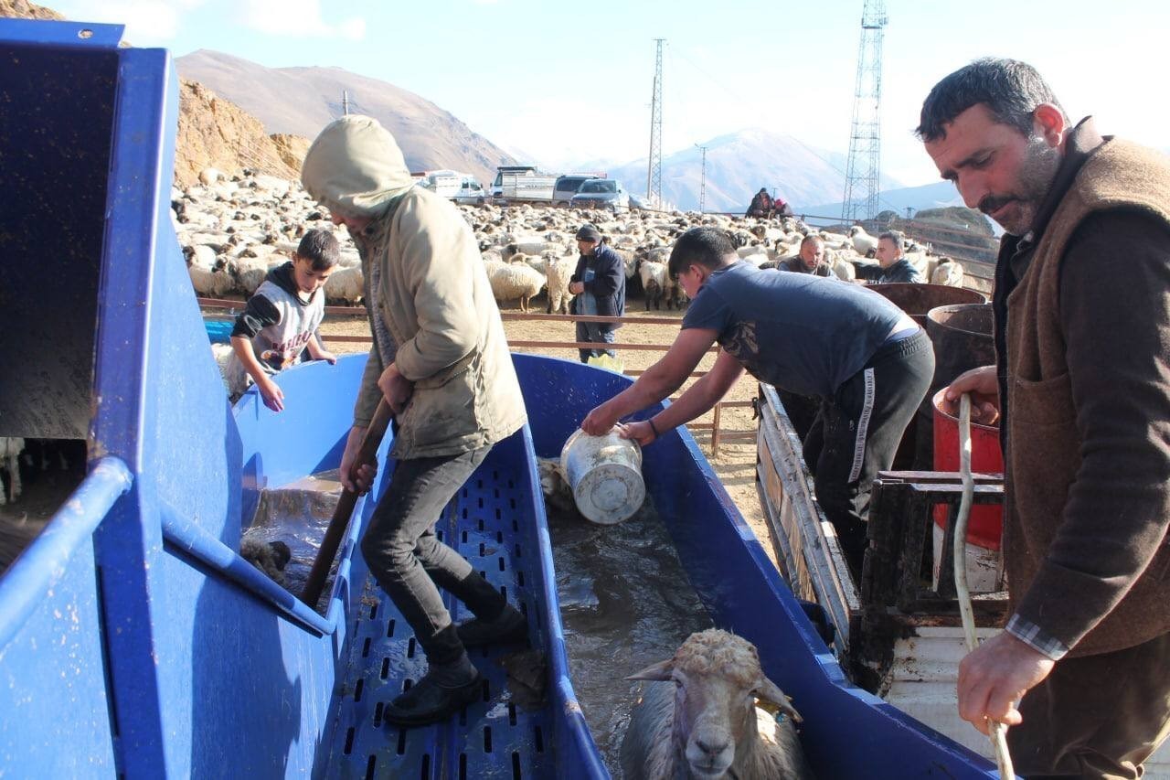 Bayburt'ta, İl ve İlçe Tarım ve Orman Müdürlükleri, hayvanların hasta olmaması adına küçükbaş hayvanları yıkama ve ilaçlama çalışmasını hızlandırdı.
