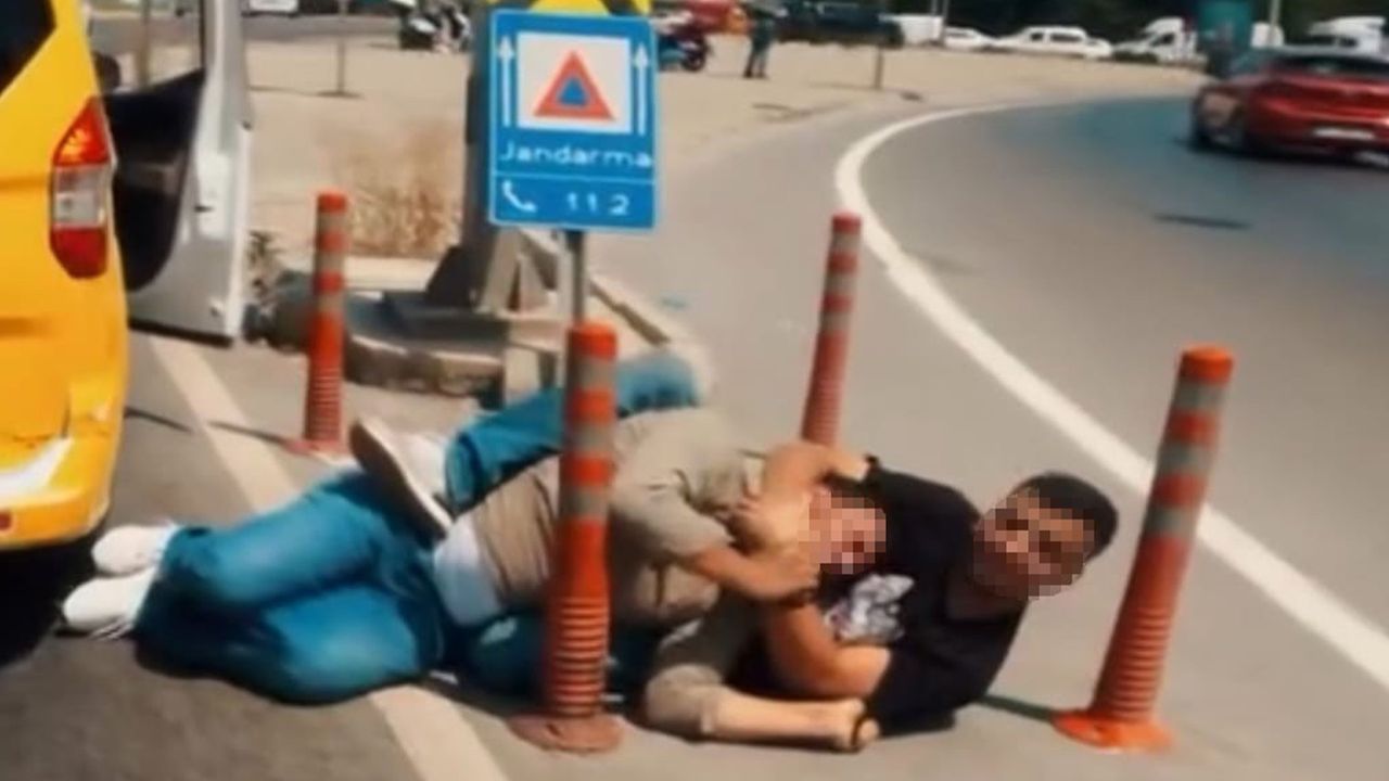 Bu ilginç kavga yoldan geçen motosikletlinin kask kamerasına yansıdı. Kavgayı ise taksici aracından inerek önledi.