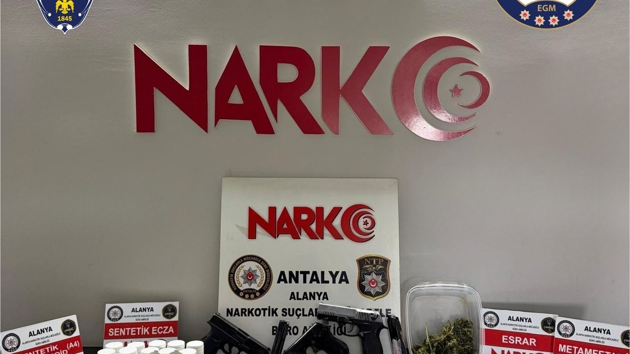 Yapılan aramalarda yaklaşık 22.240 kullanımlık sentetik kannabinoid (A4), bin 278 adet sentetik ecza, 38 gram esrar, 1 gram metamfetamin ile 3 adet tabanca, 3 şarjör, 69 fişek ve 1 hassas terazi ele geçirildi.