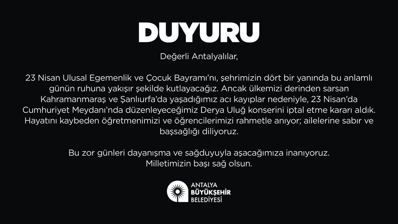 İptal kararı ile ilgili açıklamada, “23 Nisan Ulusal Egemenlik ve Çocuk Bayramı’nı, şehrimizin dört bir yanında bu anlamlı günün ruhuna yakışır şekilde kutlayacağız. Ancak ülkemizi derinden sarsan Kahramanmaraş ve Şanlıurfa’da yaşadığımız acı kayıplar nedeniyle, 23 Nisan’da Cumhuriyet Meydanı’nda düzenleyeceğimiz Derya Uluğ konserini iptal etme kararı aldık. Hayatını kaybeden öğretmenimizi ve öğrencilerimizi rahmetle anıyor; ailelerine sabır ve başsağlığı diliyoruz. Bu zor günleri dayanışma ve sağduyuyla aşacağımıza inanıyoruz. Milletimizin başı sağ olsun” denildi.