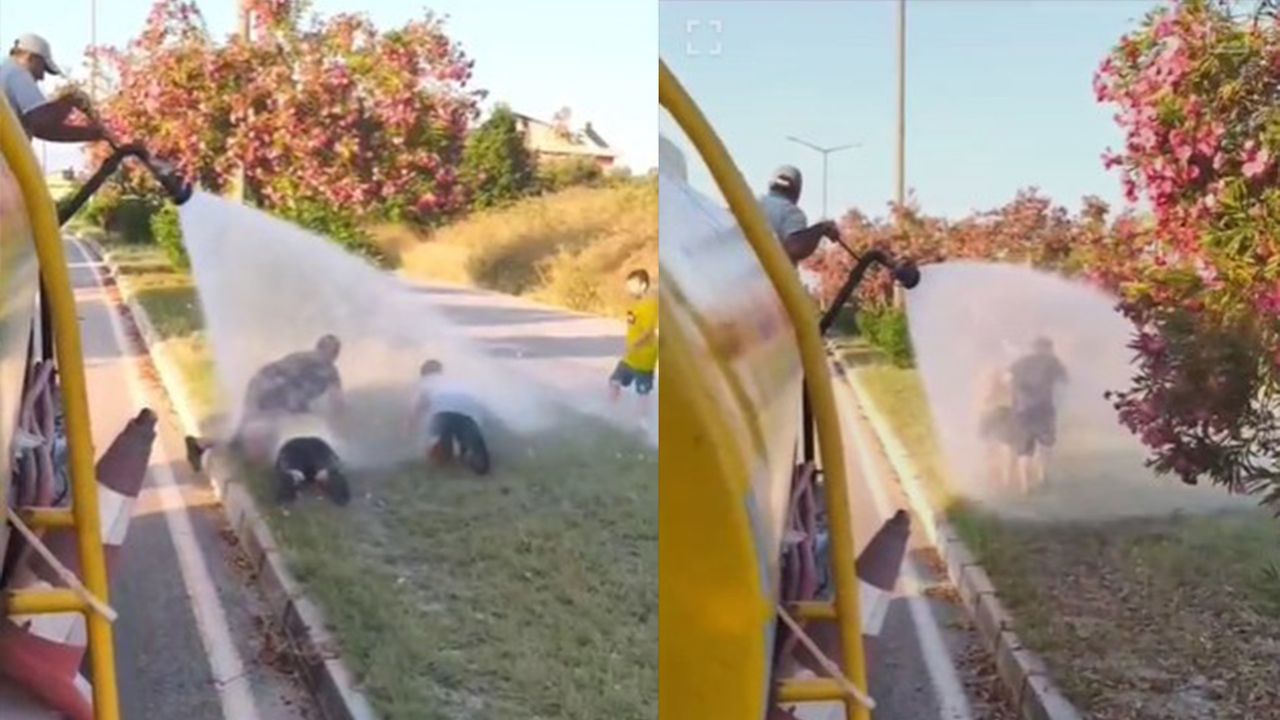 Manavgat’ta Çolaklı Süral Caddesi'nde Manavgat Belediyesi Park ve Bahçeler Müdürlüğü'ne ait sulama aracını gören çocuklar, yaklaşarak sıcak havada serinlemek istediklerini söyledi. Tanker sürücüsü de çocukların bu isteğini geri çevirmeyip hortumla üzerlerine su sıkarak serinletti. Çocukların neşesi ve sıcak havanın etkisi kameraya yansıdı.