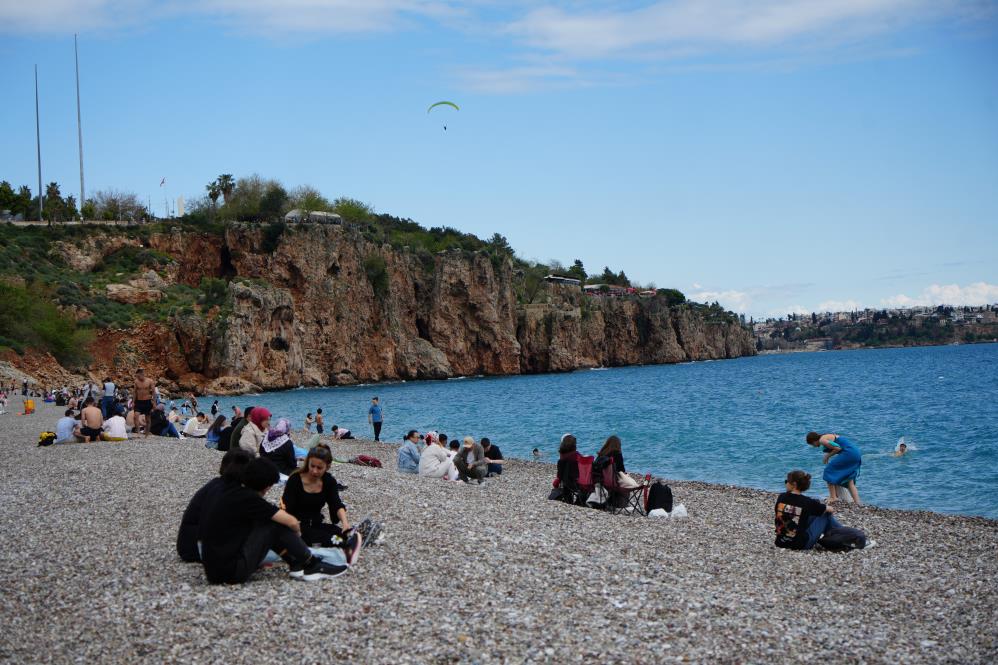 Günlerdir süren yağışların ardından güneşin yüzünü göstermesiyle Antalya adeta baharı değil, yazı karşıladı. Hava sıcaklığı 18 dereceye, deniz suyu sıcaklığı ise aynı seviyeye ulaşınca tatilciler sahillere akın etti. Antalya’nın simge noktalarından Konyaaltı Sahili, kalabalık görüntüleriyle yaz aylarını aratmadı. Kimi kumsalda yürüyüş yapmayı tercih ederken, kimileri sahil şeridindeki banklarda manzaranın keyfini çıkardı. Deniz kenarında çocuklar çakıl taşlarıyla oynarken, gençler ve aileler denizin serin sularında yüzdü. Bazı vatandaşlar, kayalıklardan denize atladı, bazıları ise denizi izleyip dinlendi.