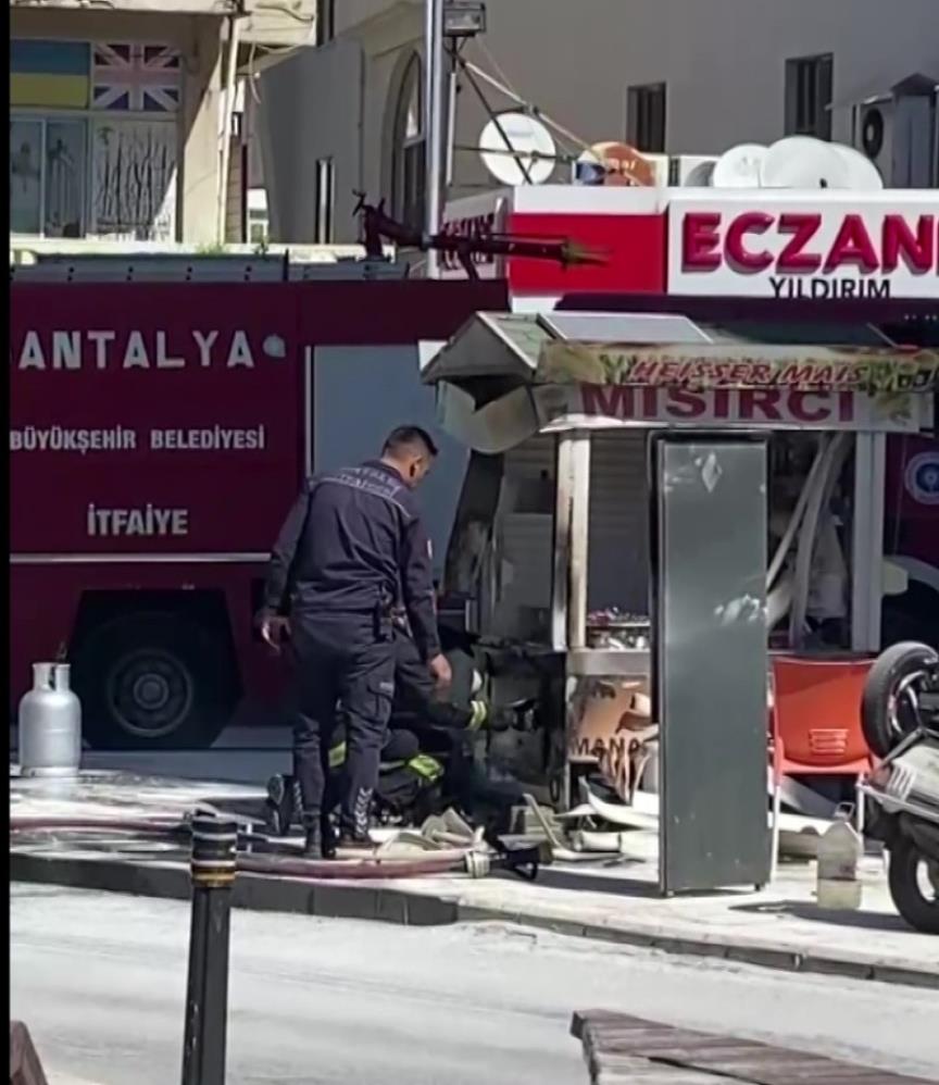 Antalya’nın Manavgat ilçesi Aşağı Pazarcı Mahallesi Fevzipaşa Caddesi girişinde kaldırım üzerinde bulunan Süleyman Şehirli isimli vatandaşa ait seyyar tüplü mısır arabasında bilinmeyen bir nedenle yangın çıktı. Tezgahtan dumanların yükseldiğini gören çevredeki vatandaşlar yangın tüpü ile müdahale etti.