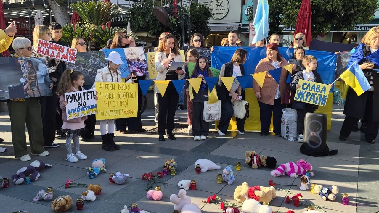 Antalya'da yaşayan Ukraynalılar, Rusya'nın işgali sonrası dört yıl süren direnişi anmak için Saat Kulesi önünde buluştu. Ukrayna Başkonsolos Vekili Yuliia Kuchma, Ukrayna-Rusya savaşının 4. yıl dönümü nedeniyle düzenlenen anma programında basın açıklaması yaptı.