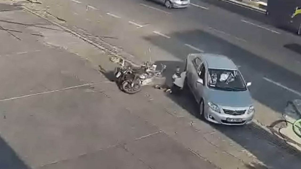 Görüntülerde otomobil ile motosiklet çarpıştığı sırada motosiklet sürücüsünün aracın kapısına tutunarak bir süre asılı halde seyrettiği ve sonrasında yere düştüğü görüldü.