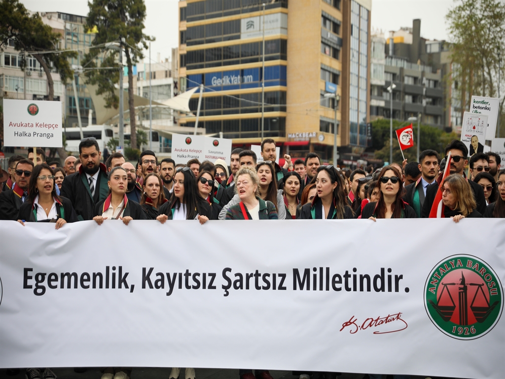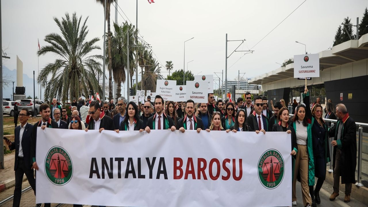 Burada konuşan Antalya Baro Başkanı Ali Çağdaş Bozaner, hukuksuzluklara karşı Antalya Barosu olarak tespit yaptıklarını, raporlar oluşturduklarını ve görevde olduklarını söyledi. Bozaner, “99 yıllık Antalya Barosu olarak bugüne kadarki bilgimiz, birikimimiz ve avukatlık mesleğimizin kurallarının getirdiği tarihi vizyonumuzla, Anayasadan aldığımız güçle hukuksuzluğun tam karşısındayız. Tüm bu aşamaları sadece hukuk devleti ve insan haklarına yönelik değil, Cumhuriyetin temel dinamiklerine, demokratik ilkelere, milletin iradesine açıkça bir meydan okuma olarak değerlendiriyor ve bunu bir tasviye girişimi olarak nitelendiriyoruz” dedi. (DHA)