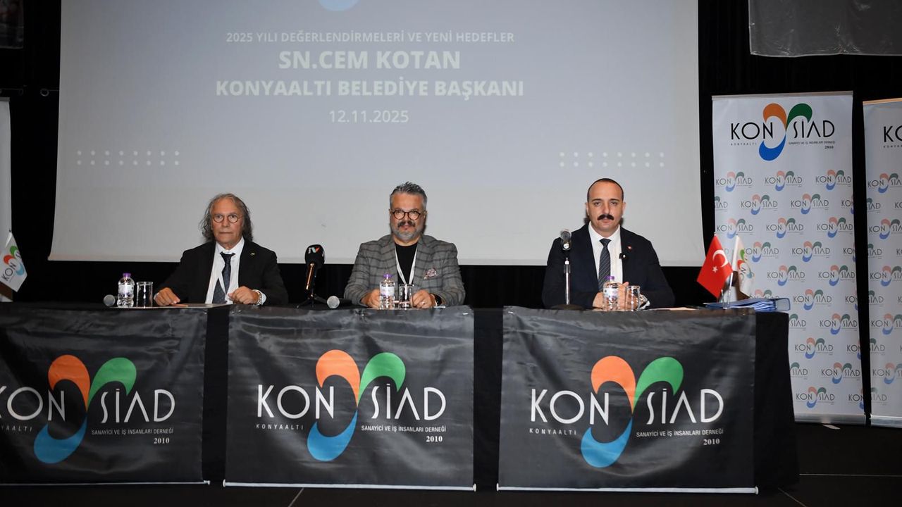 Konyaaltı Belediye Başkanı Cem Kotan, Konyaaltı Sanayici ve İş İnsanları Derneği’nin (KONYSİAD) düzenlediği Kasım Ayı Toplantısı’na katıldı. Başkan Kotan, ‘2025 Yılı Değerlendirmeleri ve Yeni Hedefler’ konulu toplantıda, göreve geldikleri günden bu yana gerçekleştirdikleri çalışma ve planladıkları projeleri iş insanlarıyla paylaştı. Moderatörlüğünü Ali Buldu’nun yaptığı toplantıya Başkan Cem Kotan’ın yanı sıra Konyaaltı Kaymakamı Rahmi Köse, Cumhuriyet Halk Partisi Parti Meclisi Üyesi Niyazi Şen, BAKSİFED Başkanı Mustafa Cengiz, Konyaaltı Belediyesi Başkan Yardımcıları, Birim Müdürleri ve Konyaaltı’nda görev yapan muhtarlar ile KONYSİAD üyeleri katıldı. Türkiye’deki ekonomik tablonun öngörülebilir belediyeciliğin bazı zamanlarda önüne geçtiğini vurgulayan Kotan, KONYSİAD üyelerinin daima yanında olduğunu ve sıklıkla bir araya gelmekten mutluluk duyduğunu kaydetti. Toplantıda söz alan KONYSİAD Başkanı İlhami Kaplan ise katılımcı belediyecilik anlayışından dolayı ve Konyaaltı’nı birlikte yönetme sözünü tuttuğu için Başkan Kotan’a teşekkür etti.
