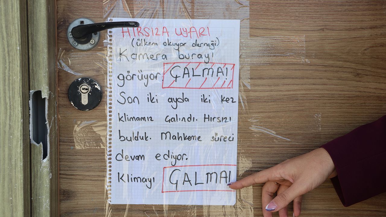 Gerçekleşen hırsızlıklar sonrası 120 bin TL zarara uğrayan Ülkem Okuyor Derneği, hırsızlar için kapıya not bırakarak hırsızlara seslendi. Geçtiğimiz süreçte gerçekleşen hırsızlıkların failleri yakalanırken mahkeme süreci devam ediyor. Hırsızlıklara karşı not asarak bıraktıklarını ifade eden dernek başkanı Havva Aydanur Ertuğrul, "İsterseniz kitapları çalın ve okuyun ama onun yerine klima, masa, sandalye gibi eşyaları çalıyorlar" dedi.