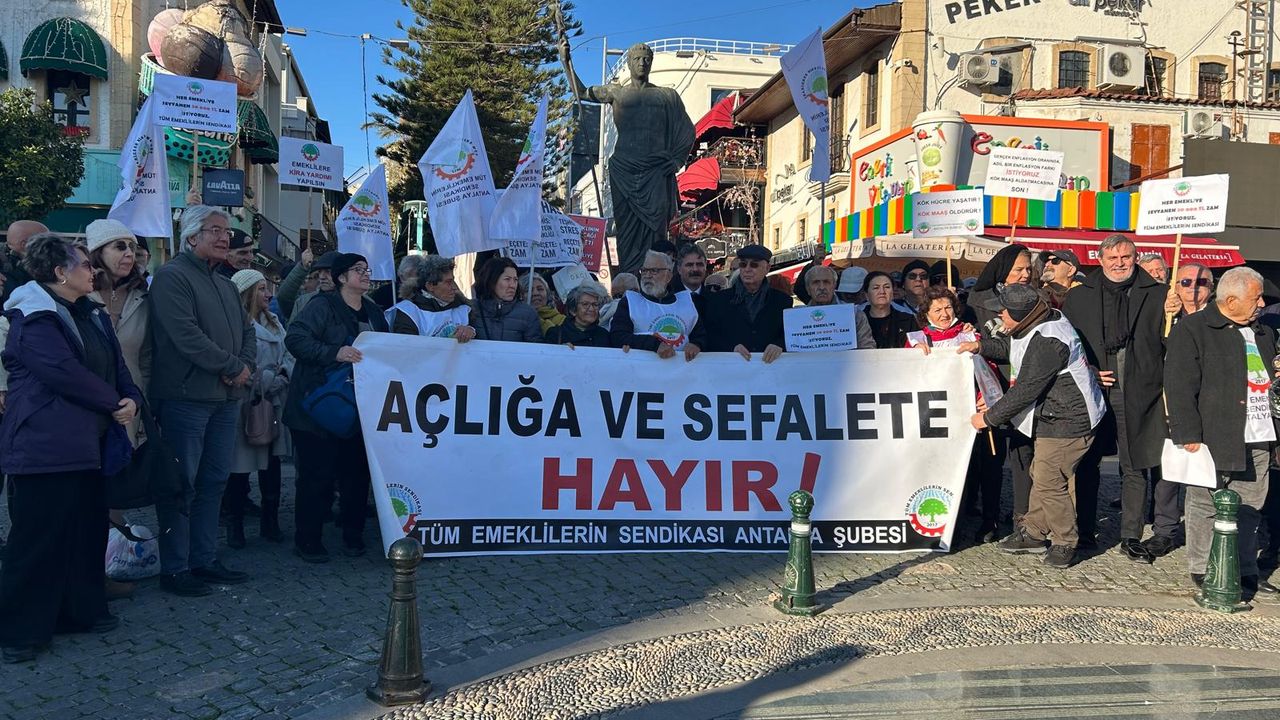En düşük emekli maaşının yüzde 18,6 oranında artırılarak 20 bin TL’ye yükseltilmesinin ardından tepkiler büyüyor. Yapılan zammın geçim koşulları karşısında yetersiz olduğunu savunan Tüm Emeklilerin Sendikası Antalya Şubesi öncülüğünde Attalos Meydanı’nda oturma eylemi yapıldı. CHP Antalya İl Başkanı Nail Kamacı’nın da katıldığı eylemde “Açlığa ve sefalete hayır” sloganları atıldı.