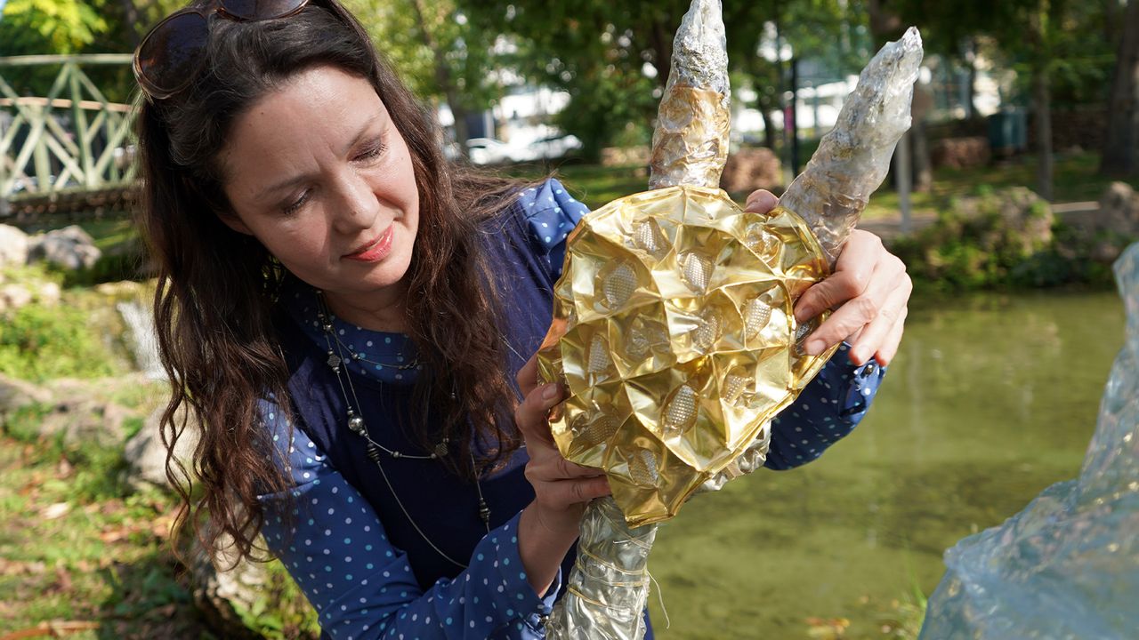 Geri dönüşüm atıklarından yeni oluşturduğu heykeli de anlatan Amirova, “Altın renkli salyangoz figürümü bulaşık deterjanı şişelerinden yaptım. Çünkü artık her şeyin güzel bir yanı var" ifadelerini kullandı.