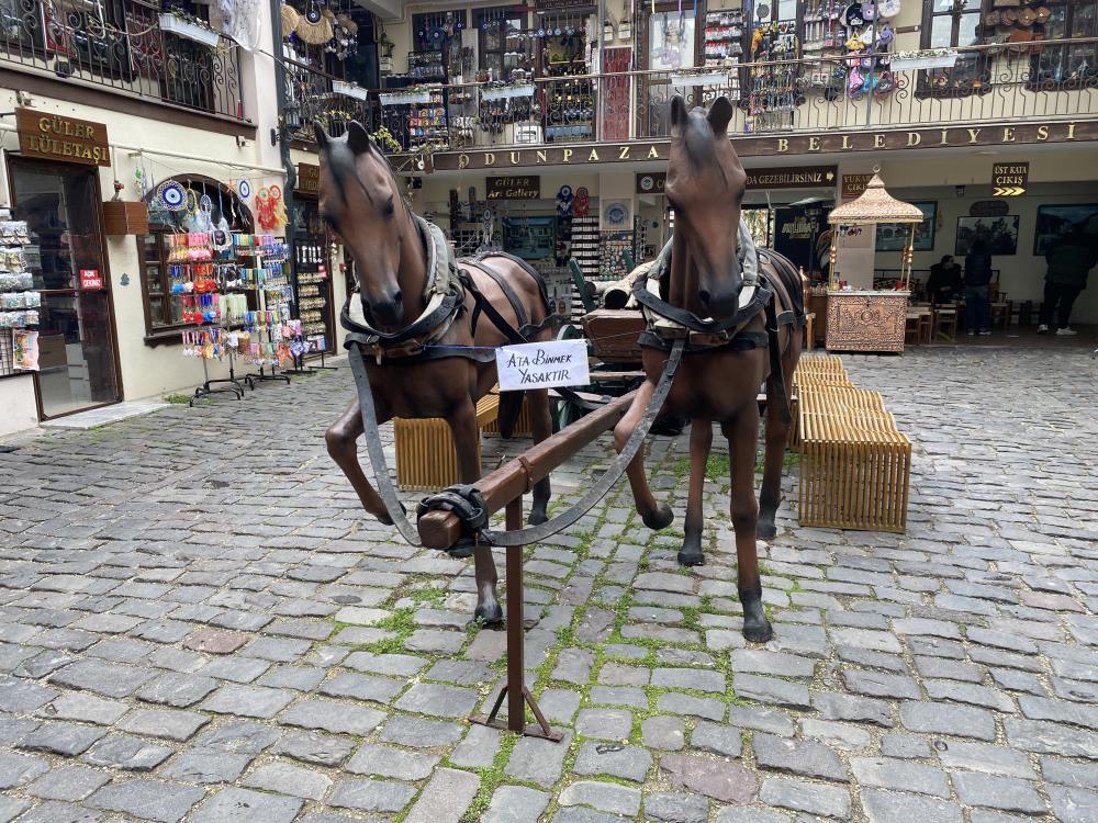 Eskişehir'in Odunpazarı ilçesinde bulunan Tarihi Atlıhan El Sanatları Çarşısı'nda ilginç uyarı yazısı vatandaşların dikkatini çekti. Vatandaşlar, at heykelleri ve at arabasının üzerine asılmış "Ata binmek yasaktır" uyarısıyla karşılaştı.