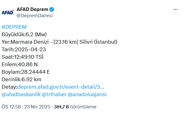 İstanbul’da deprem alarmı. Öğle saatlerinde iki kere deprem meydana geldi. AFAD tarafından verilere göre deprem şiddeti 6.2 şiddetinde hissedildiği paylaşıldı.