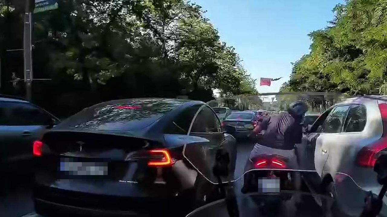 İkilinin trafikte tekrar denk gelmesi üzerine motosiklet sürücüsü araç şoförüne tükürerek uzaklaştı. Olay anı başka bir motosiklet sürücüsünün kask kamerasına yansıdı.