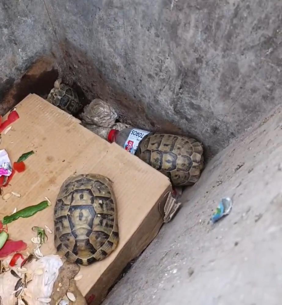 Temizlik görevlisi Cebrail Akıllı ise sabah gördükleri manzara karşısında üzüldüklerini ifade ederek, "Sabah kaplumbağaları çöpe atılmış hale bulduk. Fark etmesek preslenecekti. İnsanlarımız lütfen duyarlı olsunlar" diye konuştu.