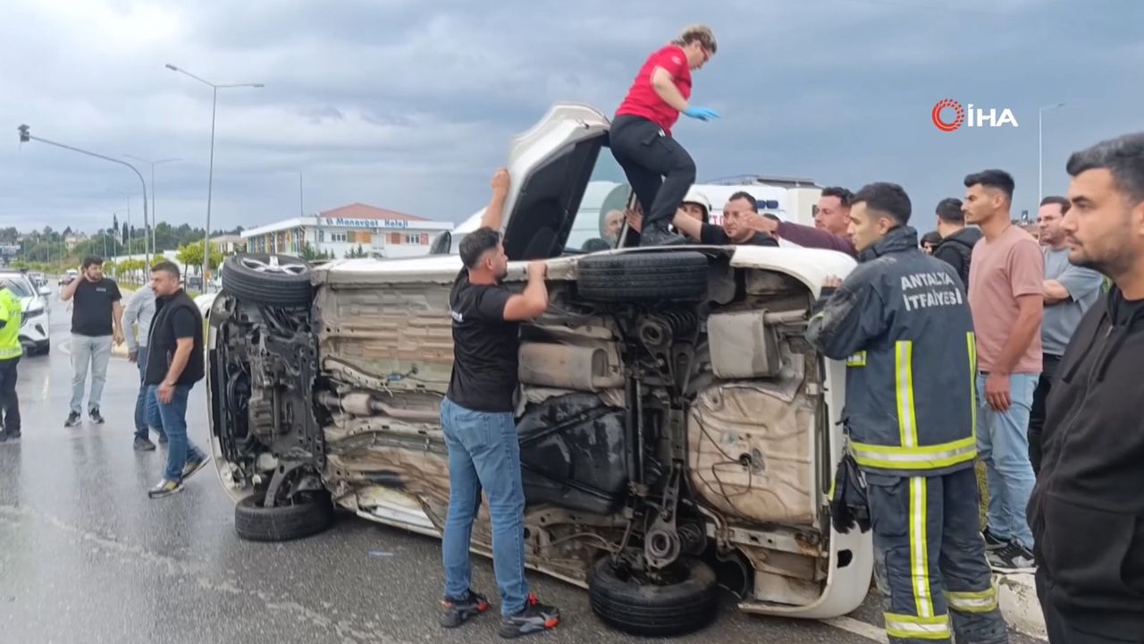 Manavgat ilçesi Sorgun Mahallesi Hüseyin Avni Akın Caddesi üzerinde Gül K.'nın kullandığı otomobil, kavşaktan çıkarken Mustafa A.'nın kullandığı otomobile çarptı. Güvenlik kamerasına saniye saniye yansıyan kazada çarpmanın şiddetiyle savrulan ve direksiyon hakimiyetini kaybeden otomobil refüje çarparak yan yattı. İhbar üzerine kaza yerine Antalya Büyükşehir Belediyesi İtfaiyesi Manavgat Birimi ve 112 sağlık ekipleri sevk edilirken araç içindeki sürücü ekipler tarafından çıkarıldı.