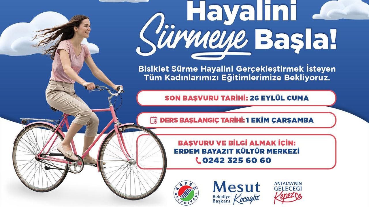 Kepez Belediyesi, kadınlara özel başlattığı bisiklet eğitimleriyle hayalleri gerçeğe dönüştürmeye devam ediyor. “Hayalini, Sürmeye Başla!” sloganıyla hayata geçirilen sosyal sorumluluk projesi kapsamında, bisiklet sürmeyi öğrenmek isteyen tüm kadınlar ücretsiz eğitime davet ediliyor. Bisiklet sürmeyi hayal ettiği halde bu fırsatı yakalayamamış kadınlara yönelik hazırlanan eğitim programı, katılımcılara hem güvenli hem de keyifli bir sürüş deneyimi kazandırmayı amaçlıyor. Kadınların sosyal hayata katılımını teşvik eden proje, aynı zamanda sağlıklı yaşam ve çevre dostu ulaşım bilincini de yaygınlaştırıyor. Ücretsiz bisiklet eğitimi için son başvuru tarihi 26 Eylül Cuma olarak belirlenirken, yeni dönem dersleri 1 Ekim Çarşamba günü başlayacak.