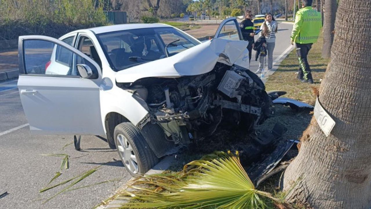 Kaza sonrası otomobil hurdaya dönerken çarpmanın şiddetiyle otomobilin ön tarafından bulunan plaka palmiye ağacına adeta çivilendi.