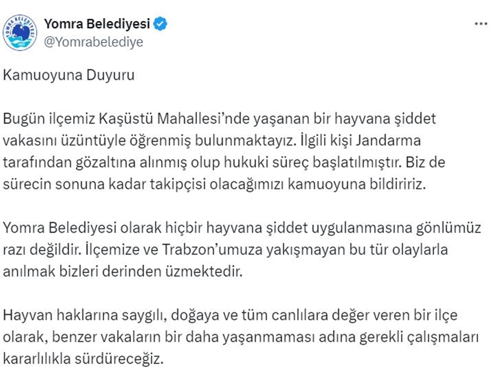 Yomra Belediyesi de konuyla ilgili sosyal medyadan paylaşımda bulunarak, sürecin takipçisi olacaklarını duyurdu.