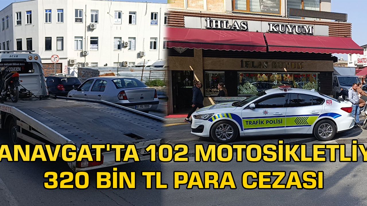 Antalya’nın Manavgat ilçesinde Trafik Denetleme Büro Amirliği ekipleri tarafından 5 ayrı noktada eş zamanlı yapılan denetimlerde 1.5 saat içerisinde 102 motosiklet ve sürücüsüne 320 bin TL ceza uygulandı.