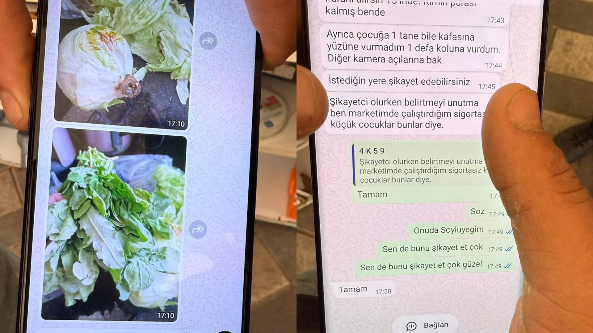 Öte yandan, K. K.'nın Whatsapp'tan Ramazan Gündeş'e, ‘İstediğin yere şikayet edebilirsin. Şikayetçi olursa marketinde sigortasız yaşı küçük çocuk çalıştırıyorum diyerek belirtmeyi unutma. Ben bir kere bile kafasına, yüzüne vurmadım, koluna bir kere vurdum' demesi pes dedirtti.