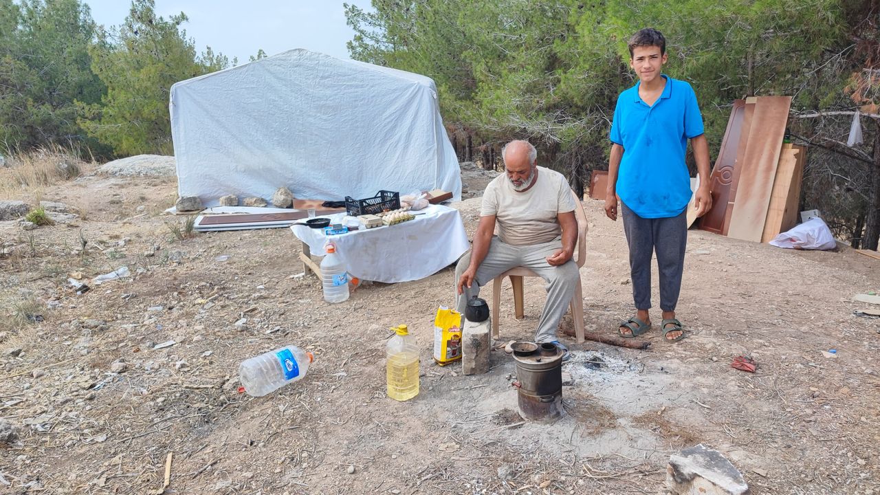 Bayram Güzeloğlu, "Ev sahibine aylık düzenli olarak 5 bin lira kiramı ödüyordum. Bir gün gelip evi sattığını söyleyip, evden çıkmamı istedi. Ben de gidecek yerim olmadığını söyleyince daha ay dolmadan beni sokağa attı. Çocukla birlikte çadır alıp, ormanlık alana çadır kurup, burada yaşamaya başladık. Hava çok sıcak, burada yaşamak çok zor oluyor ama mecbur kaldık" dedi