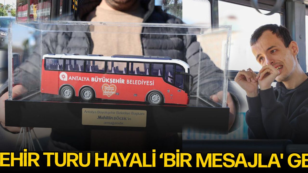 Antalya’da otobüsle şehri gezmeyi çok seven iki engelli arkadaşın hayali gerçek oldu. Antalya Büyükşehir Belediye Başkanı Muhittin Böcek’e mesaj atan iki gencin bu isteği kısa sürede yerine geldi. Otobüsle Antalya’da en çok gitmeyi sevdikleri yerleri gezen iki arkadaşın mutlulukları gözlerinden okundu.