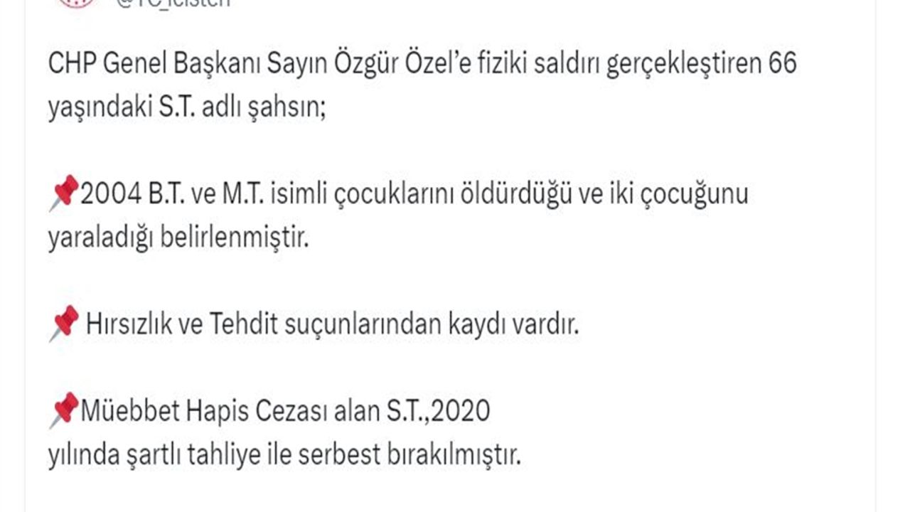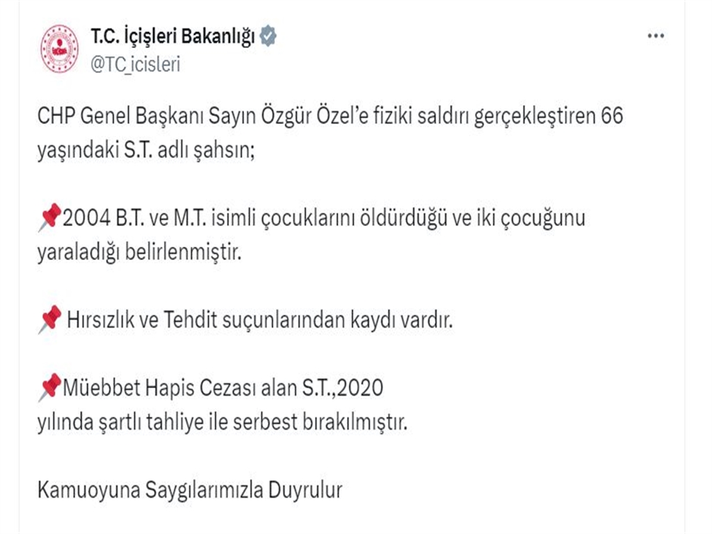 Bakanlığın sosyal medya hesabından yapılan açıklamada, "CHP Genel Başkanı Sayın Özgür Özel’e fiziki saldırı gerçekleştiren 66 yaşındaki S.T. adlı şahsın; 2004 B.T. ve M.T. isimli çocuklarını öldürdüğü ve iki çocuğunu yaraladığı belirlenmiştir. Hırsızlık ve tehdit suçlarından kaydı vardır. Müebbet hapis cezası alan S.T., 2020 yılında şartlı tahliye ile serbest bırakılmıştır" denildi.