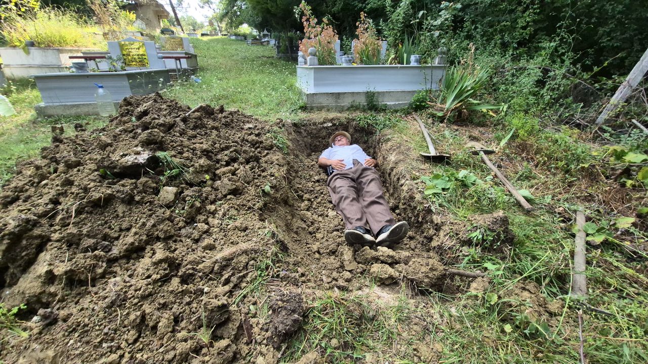 Mezarını kazarken komik olaylar da yaşadığını anlatan Karakabak, "Üst tarafta defnedilen bir kişinin mezarına gelenler, beni mezar kazarken gördüklerinde ne yaptığımı soruyordular. Mezarımı kazdığımı söylüyordum. İnanmayınca ise, 'Annemi, babamı çok özledim, onların yanına gidiyorum' diye söylerdim. Mezarımın üst beton kapaklarını yerleştirmek için bir arkadaşımı telefonla arayıp yardım istedim. Arkadaşım mezarımı kazdığıma inanmadı. Dalga geçtiğimi zannetti, ısrarla çağırınca, merak edip mezarlığa geldi. Merak edeceğini biliyordum, ona bir şaka yaptım. Mezarıma yatarak onu bekledim. Geldi mezarlıkta beni aradı, bulamayınca korkmaya başladı. Açılmış mezarı görüp yaklaştığında ise beni mezarda yatarken gördü. Beni görünce de çok korktuğunuz söyleyerek beni mezardan çıkarttı" şeklinde konuştu.