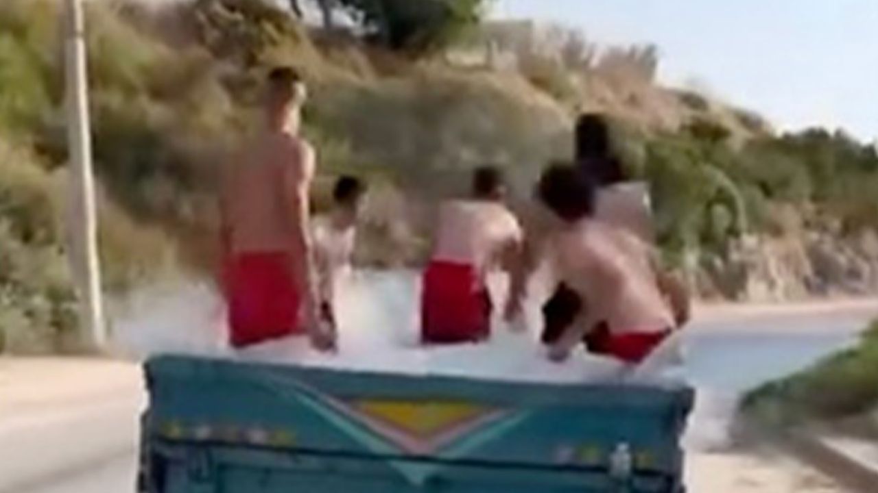 Görüntülerde gençlerin römork içindeki suyun keyfini çıkarırken aynı zamanda traktörle mahalle turu attığı anlar sosyal medyada hem büyük ilgi hem de tepki gördü.