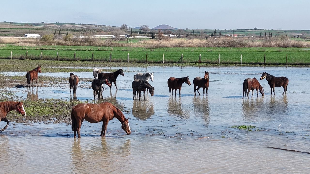 Uluabat Gölü, Bursa-İzmir kara yolunun kıyısına kadar gelirken bölgede bulunan milyonluk yarış atlarının bulunduğu tarlalar da su altında kaldı. Arap ve İngiliz yarış atları, su içinde gezinirken drone ile görüntülendi. Milyonluk tayların annesi olan damızlık atların büyük kısmının gebe olması da dikkat çekti.