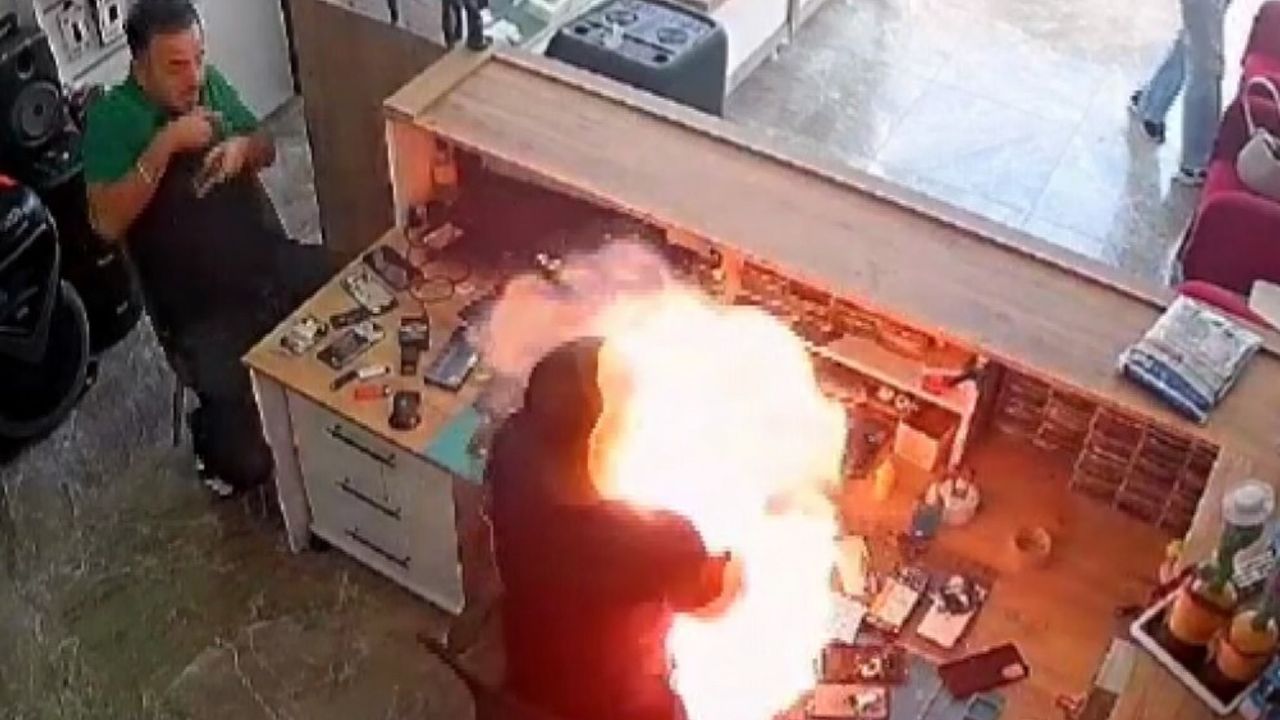 Aksaray’ın Ortaköy ilçesinde bir telefon tamircisinde yaşandı. Telefon tamircisi Ferhat Özkan (31) müşterisinden gelen telefonun bataryasını değiştirmek istedi. Telefonun kapağını söken Özkan, tam bataryayı çıkartmaya çalışırken batarya bomba gibi patladı. Alev topuna dönen batarya Özkan’ın çeşitli yerlerinde de yanıklara neden olurken, patlama anı iş yerinin güvenlik kamerasına yansıdı.