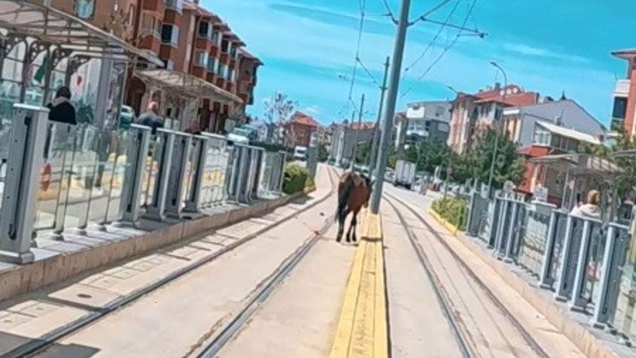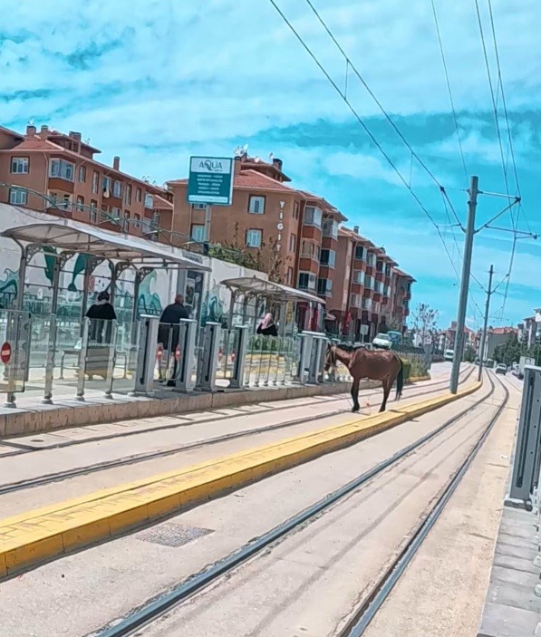 Eskişehir’de yaşayan Bedirhan Canpolat, motosikleti ile 71 Evler Mahallesi’nde bulunan 71 Evler tramvay durağının yanında seyir halindeyken enteresan bir olaya şahit oldu. Tramvayın geçtiği rayların üzerinde başıboş bir atı fark eden Canpolat’ın kask kamerası tarafından kaydedilen görüntülerde, atın rayların üzerinde tramvay durağının yanında dolaştığı görüldü.