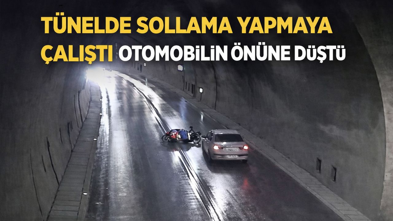Ferhat Tüneli’nde önündeki otomobili sollamak isteyen motosikletli, kaygan zeminde kontrolden çıkarak devrildi. Motosikletli, otomobil sürücüsünün dikkati sayesinde ezilmekten kurtuldu. Bir süre sonra kendi imkanlarıyla ayağa kalkan motosiklet sürücüsü, motosikletini yerden kaldırarak yoluna devam etti. Kaza anı güvenlik kamerasına yansıdı.