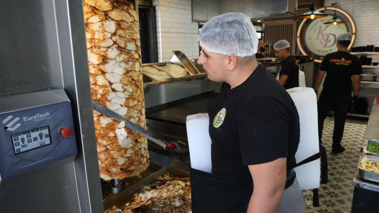 Döner ustası Doğan Turhan, "15 yıldır dönercilik yapıyorum. Millet dışarıda dayanamazken biz burada ateşin başında çalışıyoruz. Şu anda tezgah başında sıcaklık 60 derece, dışarısı ise 35-40 derece. Ateşin başında dayanamadığımız için biz de buzlu bir çözüm bulduk. Usta değişimi olduğu zaman geçen usta buzu takıp, o şekilde ocak başına geçiyor. Bunu da tamamen kendi sağlığımızı düşünerek yaptık" dedi.
