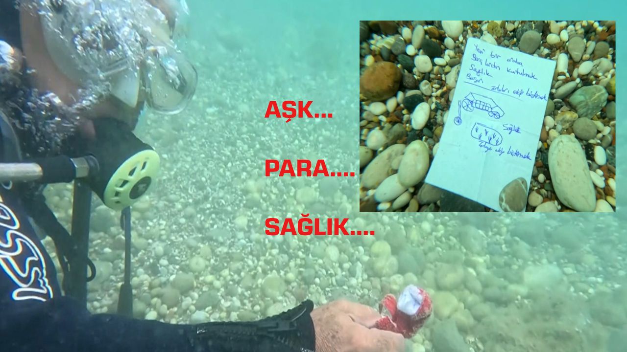 AÜ Sualtı Sporları Topluluğu üyesi öğrenciler ile Su Ürünleri Fakültesi Öğretim Üyesi Prof. Dr. Mehmet Gökoğlu, eğitim ve temizlik için Antalya'nın farklı noktalarına dalışlar gerçekleştiriyor. Dalış yaptıkları noktalarda görüntü alan ekip, su altını kirleten çok sayıda nesneyle de karşılaşıyor. Geçen günlerde eğitim için Konyaaltı Sahili'nde dalış yapan ekip, su altında 6 Mayıs'ta Hıdırellez nedeniyle bazı kişilerin denize attığı dilekleri gördü. Dileklerin bazılarının plastik poşetlerde, kurdeleyle sarılı veya keselere sarılarak atıldığı görüldü. Açıkta bulunan kağıtlarda ise daha çok ev, araba, aşk dilekleri olduğu görüldü.