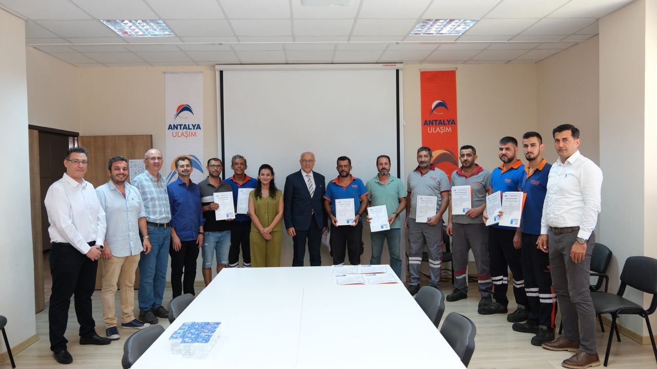 "Raylı Sistem Araçları Mekanik Bakım ve Onarımcısı" ile "Demiryolu Yol Yapım, Bakım ve Onarımcısı" olarak görev yapan 12 teknik personel, kurum içi eğitimlerini tamamladıktan sonra İstanbul Uygulamalı Gaz ve Enerji Teknolojileri Araştırma Mühendislik Sanayi ve Ticaret A.Ş. Eğitim ve Belgelendirme Şefliği (UGETAM) tarafından düzenlenen yazılı ve uygulamalı sınavlarda başarılı oldu. Eğitimleri tamamlayan teknik personele sertifikaları, Antalya Ulaşım A.Ş. Genel Müdürü Melih Dipova tarafından takdim edildi.