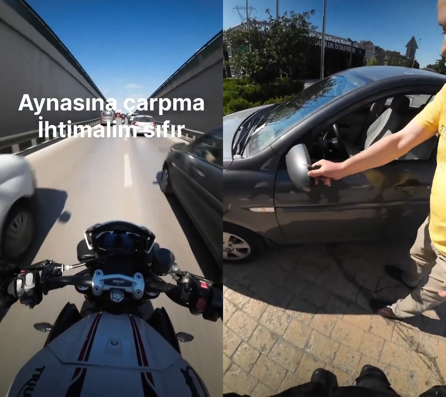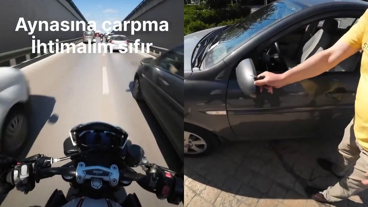 Ne olduğunu anlamayan motosiklet sürücüsü, otomobilin başına gitti. Otomobilin aynasının sallandığını gören motosiklet sürücüsü "ne zaman çarptığımı hatırlamıyorum kameram açık kayıtlara bakalım" dedi. Otomobil sürücüsü ise kayıtlara bakıldığı esnada olay yerini terk etti. O anlar motosiklet sürücüsünün kask kamerasına yansıdı.