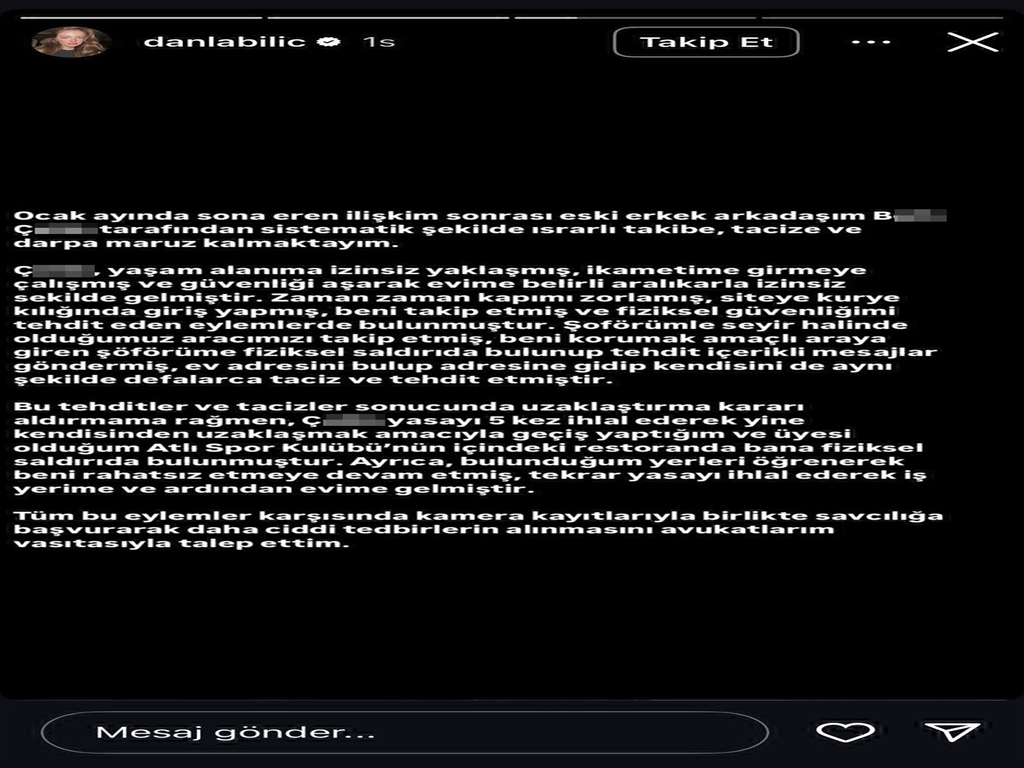 Sosyal medya hesabından olayla ilgili açıklama yapan Danla Biliç, "Ocak ayında sona eren ilişkim sonrası eski erkek arkadaşım B.Ç. tarafından sistematik şekilde ısrarlı takibe, tacize ve darpa maruz kalmaktayım. B.Ç., yaşam alanıma izinsiz yaklaşmış, ikametime girmeye çalışmış ve güvenliği aşarak evime belirli aralıklarla izinsiz şekilde gelmiştir. Zaman zaman kapımı zorlamış, siteye kurye kılığında giriş yapmış, beni takip etmiş ve fiziksel güvenliğimi tehdit eden eylemlerde bulunmuştur. Şoförümle seyir halinde olduğumuz aracımızı takip etmiş, beni korumak amaçlı araya giren şoförüme fiziksel saldırıda bulunup tehdit içerikli mesajlar göndermiş, ev adresini bulup adresine gidip kendisini de aynı şekilde defalarca taciz ve tehdit etmiştir. Bu tehditler ve tacizler sonucunda uzaklaştırma kararı aldırmama rağmen, B.Ç. yasayı 5 kez ihlal ederek yine kendisinden uzaklaşmak amacıyla geçiş yaptığım ve üyesi olduğum Atlı Spor Kulübü’nün içindeki restoranda bana fiziksel saldırıda bulunmuştur. Ayrıca, bulunduğum yerleri öğrenerek beni rahatsız etmeye devam etmiş, tekrar yasayı ihlal ederek iş yerime ve ardından evime gelmiştir. Tüm bu eylemler karşısında kamera kayıtlarıyla birlikte savcılığa başvurarak daha ciddi tedbirlerin alınmasını avukatlarım vasıtasıyla talep ettim. Yine bugün 11.04.2025 tarihinde Berk Çetin tarafından üyesi olduğum spor kulübünün içerisinde bulunan restoranda güvenlik kameralarının görüş açısında açık ve ağır şekilde yumruklanarak darp edildim. Şişli Hamidiye Etfal Eğitim ve Araştırma Hastanesi'nden aldığım darp raporu ile birlikte tekrar Aile İçi Büroya müracaat ettim. Hukuki sürecin etkin bir şekilde ilerlemesini ve güvenliğimin sağlanmasını bekliyorum" ifadelerini kullandı.