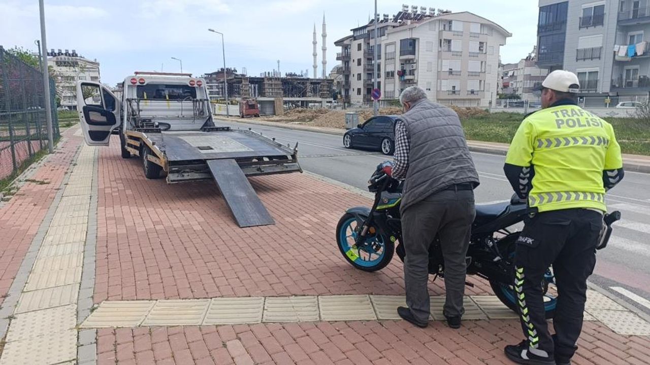 Antalya’da plakasız ve yetersiz ehliyetle trafiğe çıkan motosiklet sürücüsü denetime takıldı. Daha önce de ceza aldığı öğrenilen sürücüye toplamda 38 bin 399 lira para cezası uygulanırken sürücü belgesi de iptal edildi.
