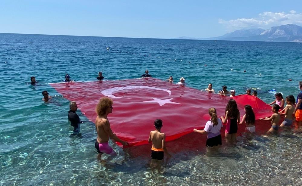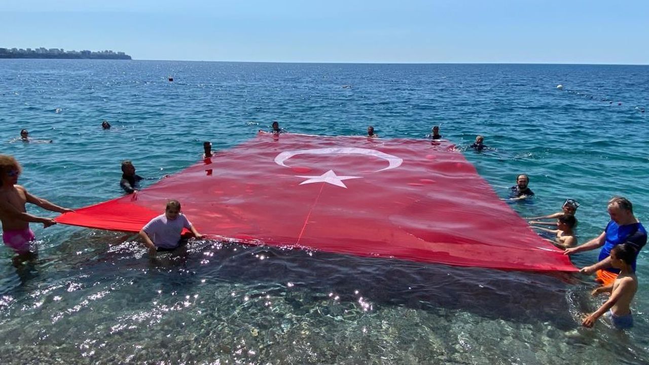 Konyaaltı Sahili’nde ise dalgıç ve yüzücüler her yıl olduğu gibi bu senede denizde dev Türk Bayrağı açtı. Özel bir dalış merkezine bağlı dalgıç ve yüzücüler Konyaaltı Sahili’nde açtıkları Türk bayrağı ile bayram coşkusuna ortak oldular. Türk Bayrağı açan dalgıçlara Türk Hava Kurumuna bağlı paramotorcular da gösterileri ile eşlik etti.